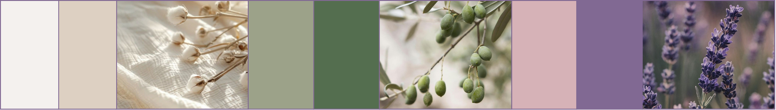 Colors inspired by the surrounding nature: white, ivory, beige, nude, sage and olive green, blush, pink, lavender and soft shades of purple patterned.