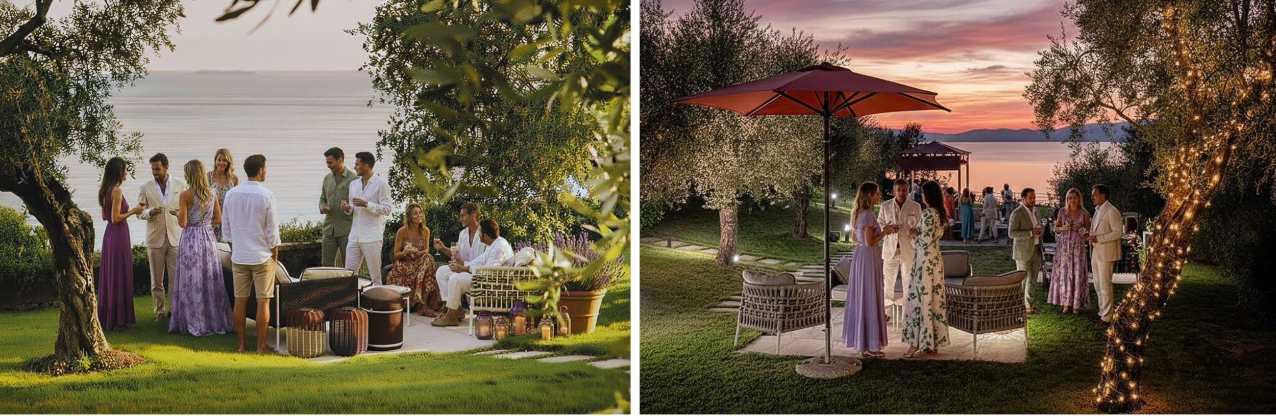 The overall mood is: a summer garden party, elegant yet relaxed, under the stars.